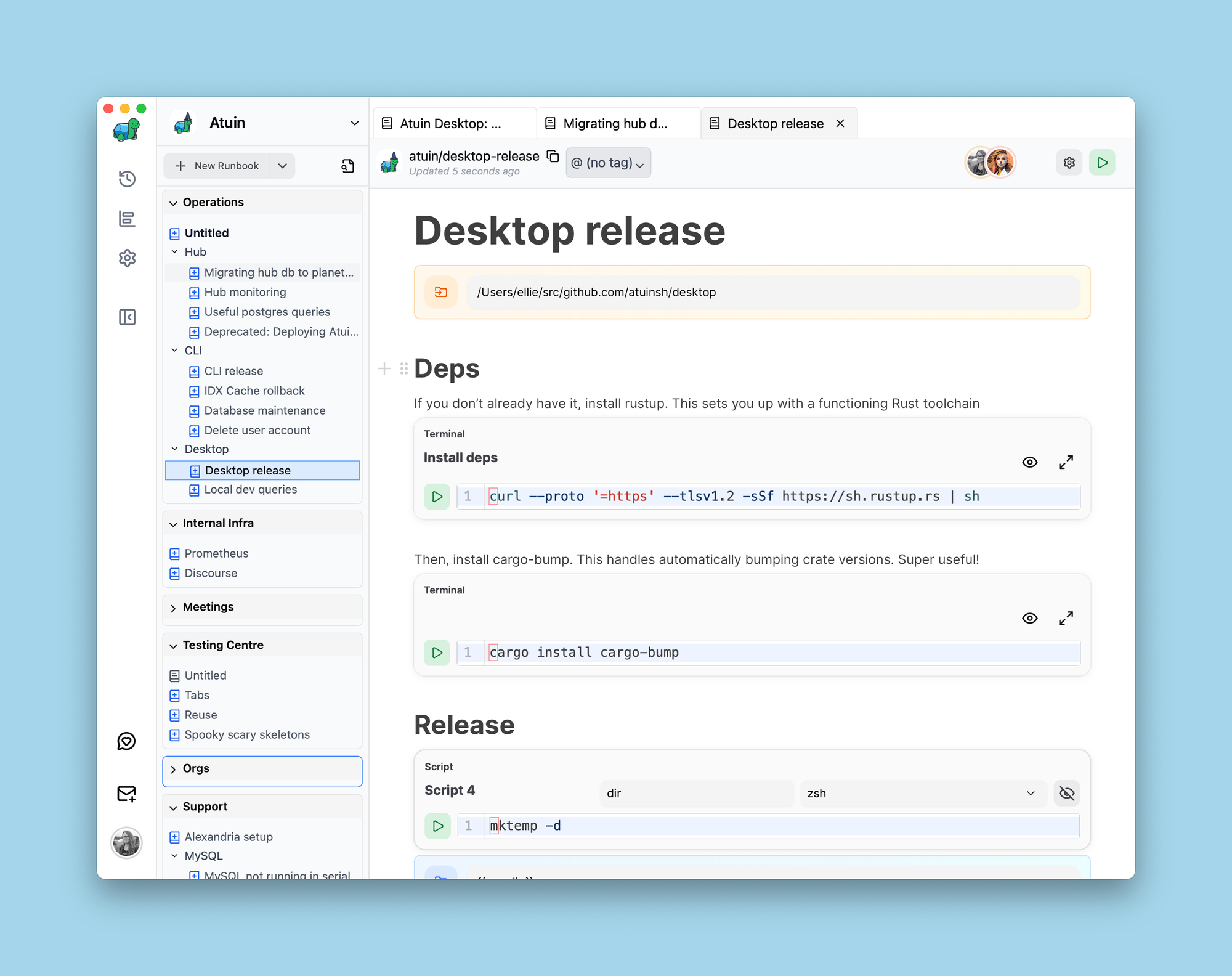 Atuin Desktop looks like a doc, but runs like your terminal. Built to make local developer workflows repeatable, shareable, and reliable.