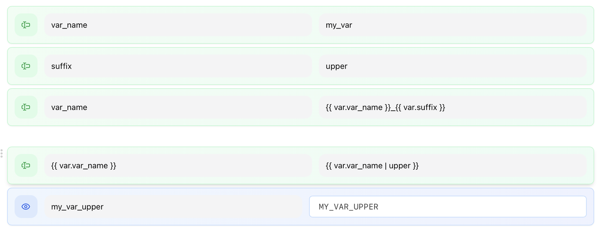 Since all inputs run through the template system and variables don’t affect context above them, it’s possible for a variable to refer to itself. For example, you could trim the newline off a variable named output by using {{ var.output | trim }} and assigning it back to output again. You can get as deep as you want with variable metaprogramming: